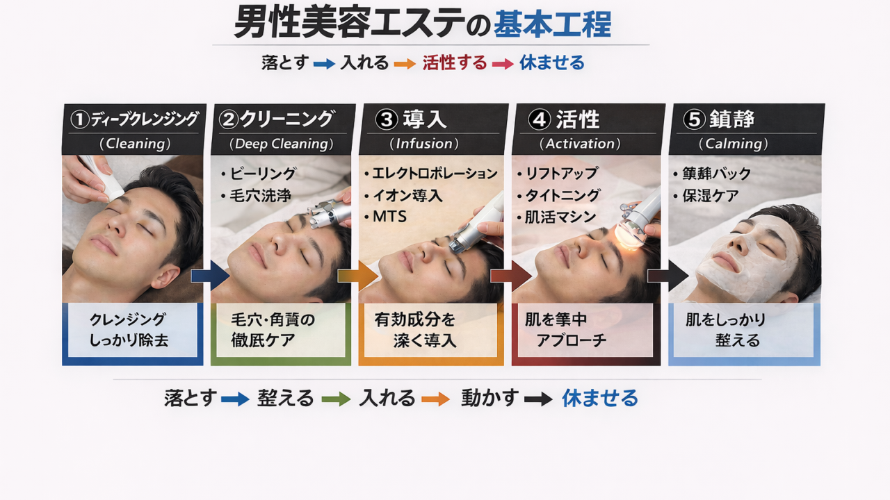 こんにちは。 サロンマティス代表の重信です。 本日は、マティスオリジナルのメンズエステにおける施術工程メソッドについてご紹介いたします。 まずはこちらの図をご覧ください。 男性の肌ケアは、基本的に以下の5つの続きを読む